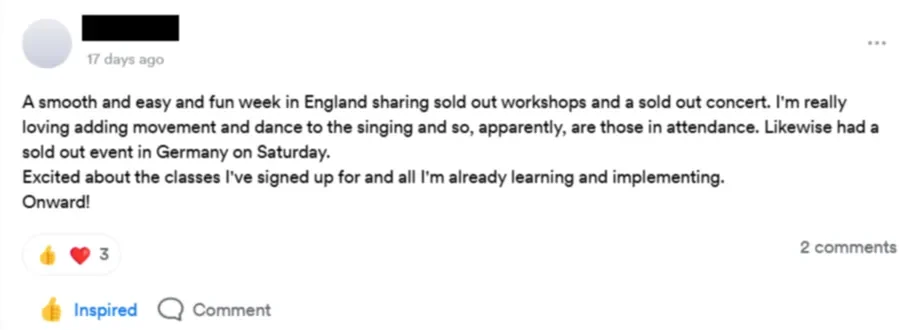 “A smooth and easy and fun week in England sharing sold-out workshops and a sold-out concert… Likewise had a sold-out event in Germany.”